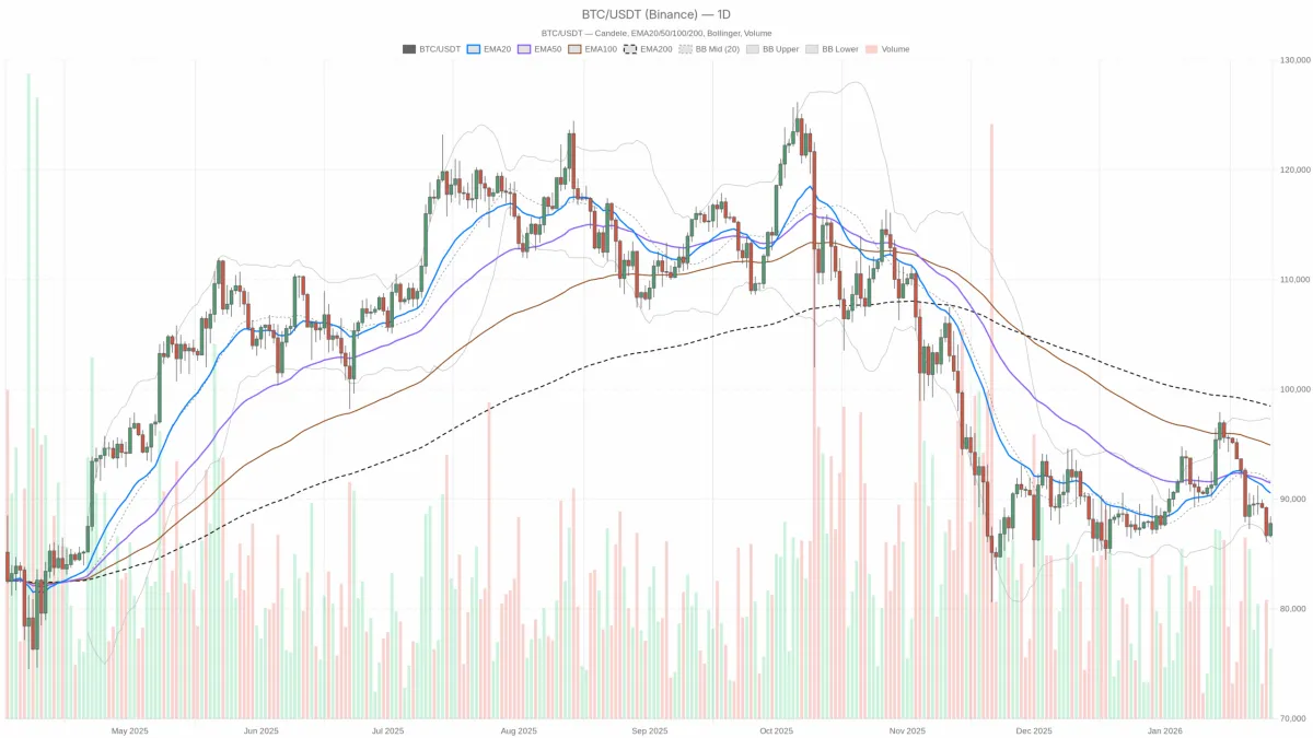 價格與20日均線重合,略低於50日和200日均線。這是一個短期平衡區域;市場正在喘息。50日均線(約8.83萬美元)和200日均線(約9.03萬美元)是日內關鍵的拋售位。多頭需要突破這些阻力位才能將反彈轉化爲持續的上漲行情。否則,每次測試這些價位都可能形成新的低點。