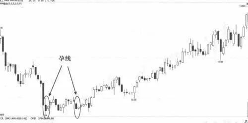 該K線組合又被稱爲多頭母子線,通常是在股市或股票經過了長期的下跌後形成的。其組合爲前一天的K線是下跌的,而後一天的K線是上漲的。並且後一天的開盤價、收盤價、最高價、最低價都位於前一交易下跌K線之內。並且最高點與最低點均未突破前一交易日K線的最高點和最低點。同時開盤價與收盤價也可能爲前一天的開盤價和收盤價。當此K線組合出現時,預示着下跌已經進入尾聲,後市將出現上漲的走勢,如圖1所示。