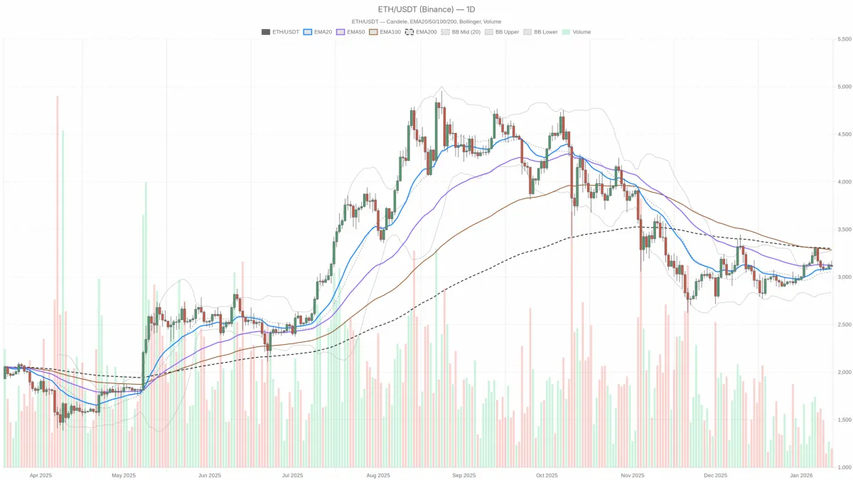 ETH/USDT 日線圖,包含 EMA20、EMA50 和成交量”loading=”lazy” />