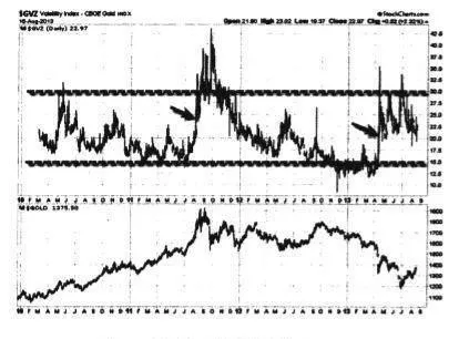 我們再回到這幅圖,一個一個來看這個指數所對應的最近這幾年的歷史行情。我們先找25或者30以上的位置,首先我們可以看到在2010年5月份,指數過了25,而且也曾經很快突破了30,我們看同期的金價剛好是—個階段性的頭部,2010年的五六月份剛好是一個短期頭部。隨後是在2010年底,GVZ也是碰了一下25,這裏的金價又是一個短期頭部。在後面的時間裏趨勢的發展就比較平淡,金價毫無懸念往上走,所以我們看到市場沒什麼情緒,因爲投資者們覺得金價上漲是非常正常的,沒有什麼可以大驚小怪的而且當GVZ跌到15左右,則說明這裏是金價的階段性底部,可以繼續做多。我們這樣來理解,爲什麼GVZ每次到15就是一個底部的區域?說明市場在這個時候對不斷上漲的趨勢有點審美疲勞,所以情緒一旦退潮,往往就是做多加倉的時機。當然那個時候黃金市場是一個單邊市,只要逢低做多就好了,所以通過觀察這個情緒指標可以輔助我們尋找價格低點。