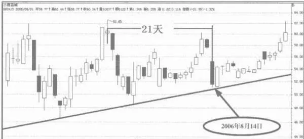 潛在的風險:連接5月3日和6月12日低點做一條支撐線,我們看到價格的最近支撐處於52.4元一帶。如圖所示,(注意:爲了便於講解,本書統一使用對數座標和復權價)
