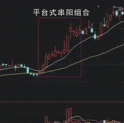4. 平臺式串陽組合,在不斷上升的陽線中具有平臺整理形態,走勢有着放量加速上漲超過短期頂部,以及5根陽線過進行洗盤的可能;