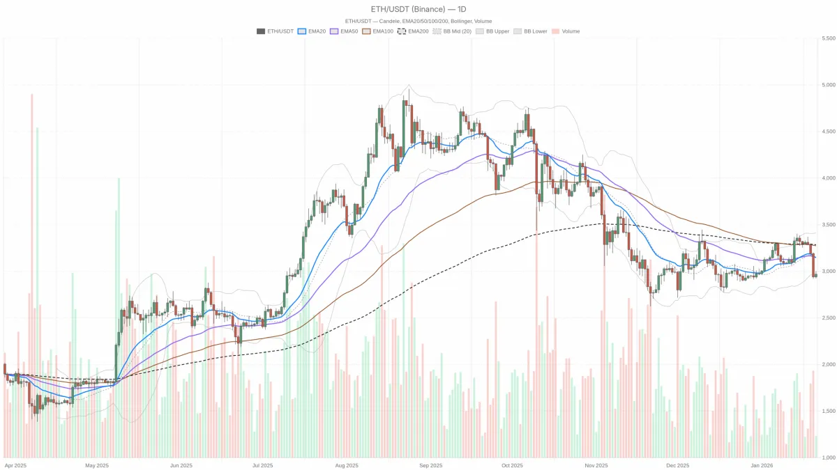 以太坊 (ETH) 仍處於防禦性交易狀態,價格徘徊在2,970 美元左右,在日線圖上接近布林帶下軌,且低於所有關鍵移動平均線。