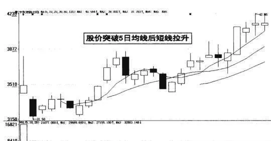 2.一波短線拉昇中,股價往往依託5日均線上漲,即股價收盤保持在5日均線上方,5日均線以45度以上角度保持向上。
