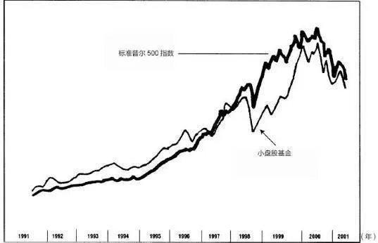 此外,奧肖內西指出,投資這種股票是非常困難的,因爲交易額太小。圖11-1表明了1991~2001年小盤股基金和標準普爾500指數的對比結果。如圖所示,1998~2001年,小盤股與標準普爾指數漲跌同步,小盤股的表現遠遠低於大盤。實際的市場表現表明小盤股幾乎沒什麼優勢。1991~1998年,小盤股的表現確實超過大盤。但接下來,標準普爾500指數的表現勝過了小盤股。