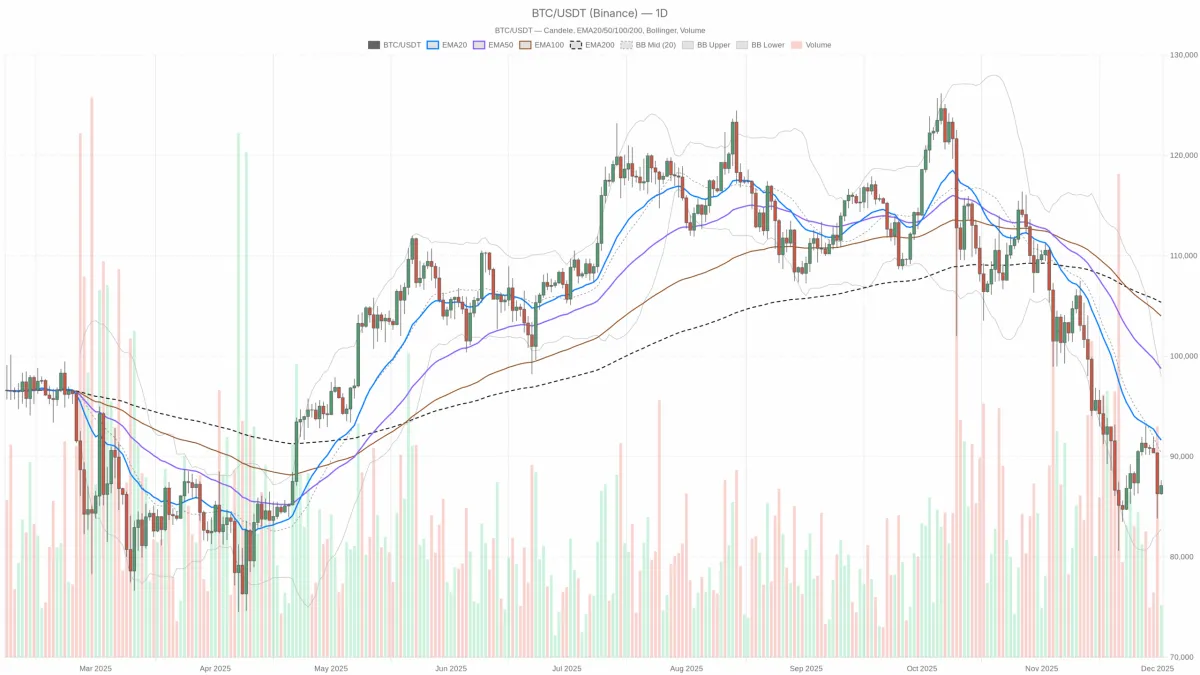 從日線圖來看,比特幣交易價格接近 87,099 美元,低於所有關鍵指數移動平均線。價格低於 20 日均線(約 91,640 美元)、50 日均線(約 98,755 美元)和 200 日均線(約 105,364 美元)。這種較大的價差證實了成熟的下跌趨勢,短期、中期和長期均線均指向現貨價格上方。對於持倉交易者而言,這種趨勢表明,至少在 20 日均線被重新站穩之前,多頭仍需承擔舉證責任。