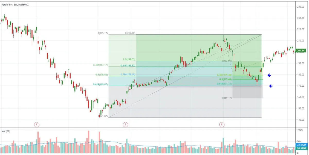 一種回撤工具是根據價格從接近 140 美元到 215 美元的上漲行情來預測回撤位。另一種斐波那契回撤工具是根據價格從 170 美元到 215 美元的上漲行情來預測回撤位。