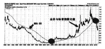 第二個維度,如果你發現資金離開了債市,那麼你應該知道它們的第一站一般會首選股市。這個時候,首先你要把金價或銀價和股指做一個對比,通過觀察它們的強弱程度清楚看一下現在應該做哪一個比較合適一點,是繼續交易黃金還是應該去買股票?我們先看下面黃金與標普的比價圖(圖5-2)。