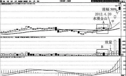 與A區域相對應的B區域,成交量保持持續小量。A、B兩個區域合參,該股呈現了非常經典的“水漫金山”形態。