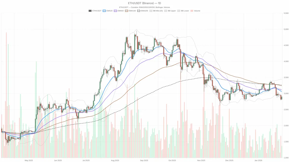 時間框架 giornaliero è chiaramente看跌。 ETH 配額 2.894,5$,sotto la fascia 3.050–3.100$ 鴿子帕薩諾 EMA 20 e EMA 50 e 本遙遠的 dalla EMA 200 a 3.261$。 Finché il prezzo rimane sotto questo blocco di medie, ogni rimbalzo è tecnicamente un pullback dentro un trend disendente, non ancora una nuova fase impulsiva。
