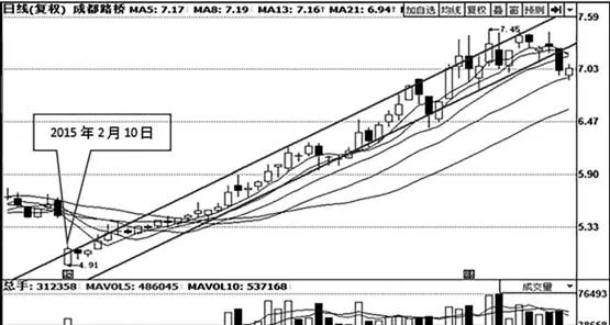 如上圖所示,成都路橋(002628)。成都路橋的股價自2015年2月10日開始啓動了一波震盪上升走勢。在上升過程中,該股股價始終處於上升通道線區域內。