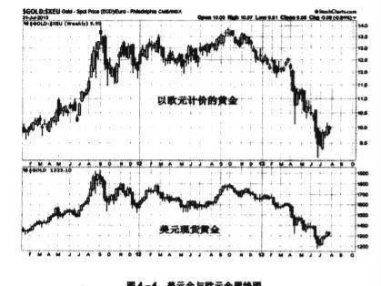 圖4-4的作圖很簡單,只需要黃金價格除以某個貨幣,例如圖4-4中的歐元,就可以得到兩者之間的比價關係(上方是歐元金,下方是美元金從圖4-4裏我們可以看到歐元金和美元金的趨勢雖然一樣,但某些轉折點的圖形不太相同,比較適合單邊投機的交易員互相參照,以此來爲自己的判斷增加一個維度。