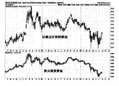 如果想看一下商品貨幣澳元,就是以澳元計價的黃金是怎麼樣的情況,我們如法炮製也可以得到下面的這幅澳元金的圖(圖4-5)。
