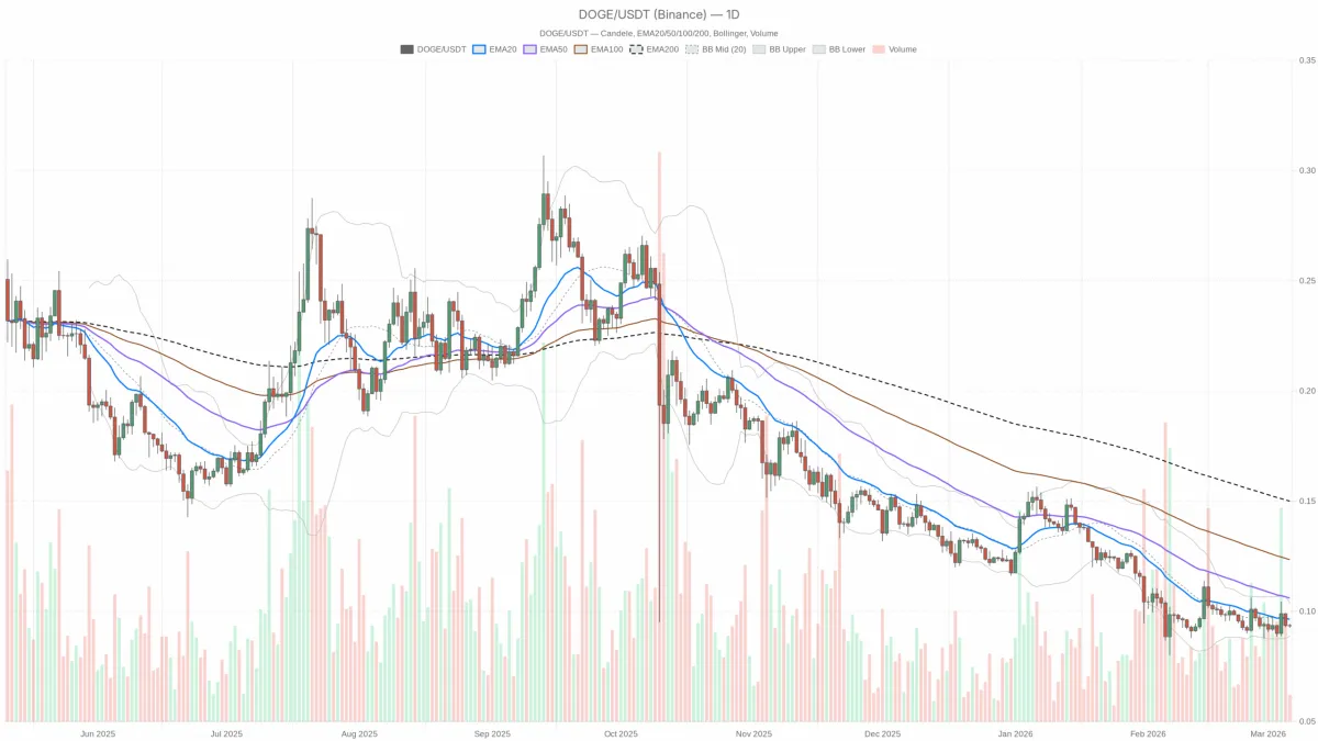 在整體避險情緒高漲的加密貨幣市場環境下,狗狗幣價格徘徊在 0.09 美元附近,波動性較小,市場情緒明顯偏向防禦型。