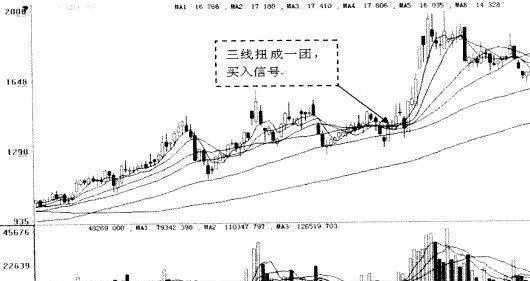 三線扭成團是指5日、10日、20日和30日等均線中,任意三條移動平均線走到一起,形成粘連形態的一種走勢。用眼觀察,能明顯看出5日、10日、20日或30日三條移動平均線貼得很近,有扭成團的感覺。處在上升行情中的扭成團形態,是做多信號,應買入股票。其理由是,在上升行情中,5日,10日,20日(或30日)三條均線走到一起時,顯示股價跌到了低位,以前做多的投資者的買入成本趨於一致,處於較低的價位,不會輕易做空,只要多頭稍加發力,股價就會止跌反彈,所以上升行情中出現的扭成團形態,是可靠的做多信號,可放心買入,獲利較有保障。