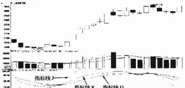 如上圖所示,KDJ指標中包括三條曲線分別是指標線K、指標線D和指標線J。這三條曲線中波動最頗繁的是指標線J。指標線K次之。指標線D的波動最爲緩慢。