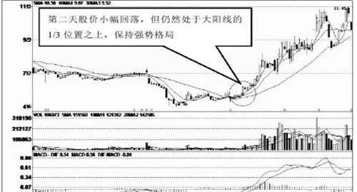 在明顯的下跌趨勢中,一根大陽線阻止了股價的繼續下跌勢頭,第二天股價在這根大陽線的1/3位置之上強勢運行,說明市場依然保持強勢狀態,則基本肯定了前一天的大陽線成果。這種情況也可以分爲三種類型。