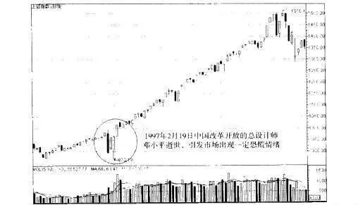 2.經歷過風雨,方能見彩虹。這種現象不僅在個股中存在,即使大盤指數也有類似情況。例如:1997年2月19日,中國改革開放的總設計師鄧小平逝世,很多股民擔心對待股市的政策會變,第二天早上,證券所填寫賣單的窗口擠得人山人海,可是滬深兩市低開92點後被龐大的市場資金迅速推高,當天就拉出一根大陽線,成交量也同步放大,此後行情一路走高(見圖9-3)。