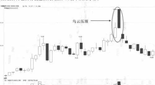該K線組合是由兩個K線組合而成的,前一個K線爲上漲K線,後一天的K線爲下跌K線,並且後一天K線的開盤價比前一天K線的收盤價要高出很多,但是在當天收盤時,其收盤價與前一天K線的收盤價基本接近,那麼該K線組合就被稱爲烏雲壓頂,隨後股價有可能出現下跌,如圖1。該K線通常出現在上漲階段末期。