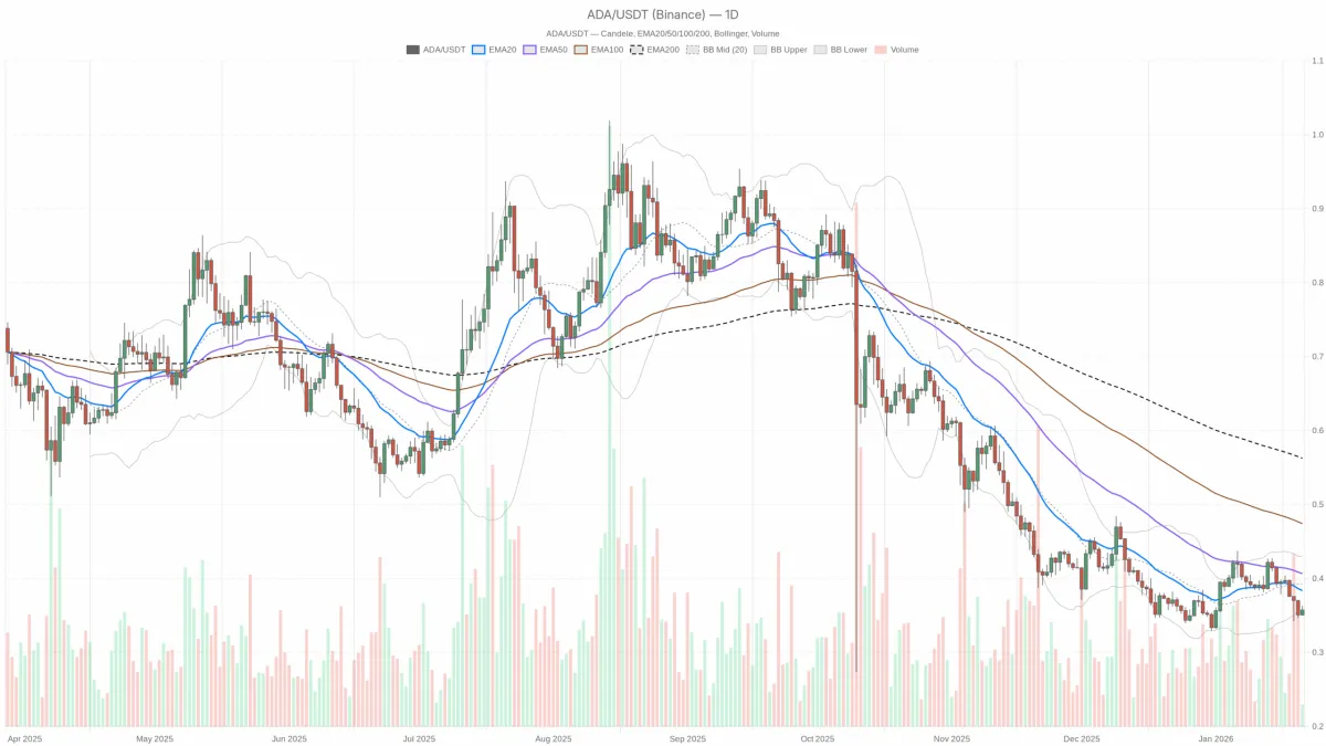 Lo 場景 rialzistaparte dall'idea di均值迴歸在聯合國競賽中 paura estrema。 ADA è schiacciata sulla banda bassa daily, con RSI in zona 40 e MACD scrapico: gli Inventione per un rimbalzo tecnico ci sono.