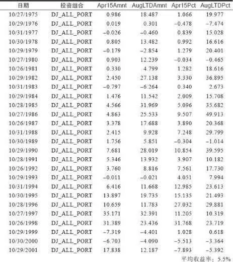 第一個測試是衡量價值型指標的績效的對照組。表11-3表示前述的道瓊斯工業指數全部30只成分股買進和賣出日期。1975~2001年,10月~次年4月平均漲幅爲5.5%。如果你買了道瓊斯指數全部30只成分股,並在次年4月賣出,就得到這個收益率。現在我們希望能做得更好。也許我們能做得更好,但需要比較新的投資方法和這種方法的投資收益率,來看看新的方法是否有更好的收益。如果我們勝過比較基準的績效標準,那我們就超過了大盤。