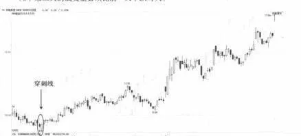 第二天股市在更底的位置開盤,然後一路上漲,在收盤時達到前一天下跌K線的實體一半以上的位置,這樣的K線組合就被稱爲穿刺線,如圖1。該K線組合是多方常見的一種宣戰模式,當出現該組合後,股民就該考慮買入股票了。