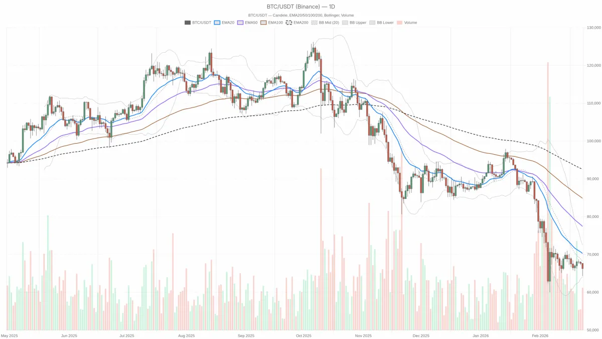 價格在 20 日、50 日和 200 日均線下方交易,且三者之間有明顯分離,這確認了主導性的下跌趨勢。短期移動平均線(20 日均線)正加速遠離價格,表明持續的拋售壓力和缺乏積極的逢低買盤。在比特幣收盤價能夠至少重新站上 20 日均線之前,目前的反彈僅僅是下跌趨勢中的機械反彈,而非趨勢的轉變。