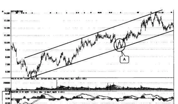如圖7-10所示,2008年11月份至2010年初,蘇寧電器(002024)股價一直保持震盪攀升的走勢,將其在震盪過程中產生的低點相連,就構成了一條上升趨勢線,然後過某一階段高點,作出上升趨勢線的平行線,就形成一個上升通道,當股價在震盪過程中回調至通道的下邊線附近,即A所示的區域時,股價止跌回升。