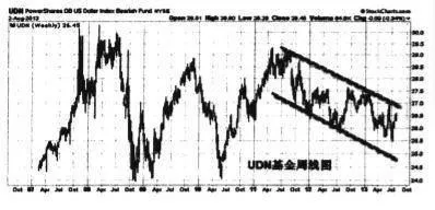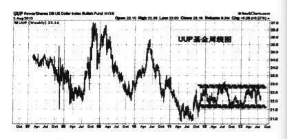 從圖4-8顯示的這幅周線圖來看,就目前而言,美元還是在一個底部的盤整區域裏面來回震盪。單從盤面上看,如果說它可以走強似乎還看不出什麼端倪。如果看UUP基金的淨值,已經低於它在2007年的發行價,或者說這隻做多美元的基金沒有賺到錢的。從2011年夏季美國爆發國債危機,到現在(2013年)其實美元是沒有怎麼動的。所以如果說現在美元走強,起碼從徳意志銀行這個基金沒有看出來。所以現在我們依然認爲美元是在一個盤整區域,雖然很多專家和媒體說美元會走中期強勢,也許未來會,但是現在沒走出來。行情沒有走出來之前我們就不能把美元預計得太強。俗話說:不見兔子不撒鷹,不見鬼子不掛弦。所以現在如果有交易員盲目做多美元、做空歐元還是有點危險,因爲還不到時候。