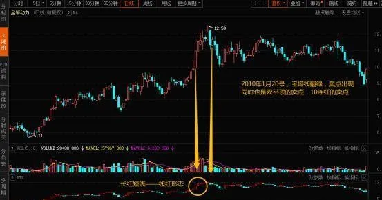 假設在高位的時候顯現一系列橫向震盪的小寶塔線的話,那這個時候顯現非常長的綠線,就是投資者賣出的機會。