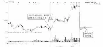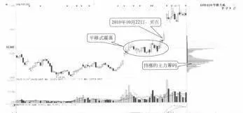 之後該股再創新高,到9月初,股價再次衝高回落,且以平移的方式震盪。從10月11日的籌碼分佈圖可以看出,該股已經在震盪區域形成一個密集峯,但低位仍然存在一個較小的籌碼密集峯,表明主力仍在持股待漲。10月22日,股價向上突破前期高.點,形成第三個買點。投資者可以繼續加倉.直至滿倉。