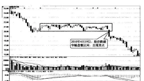 如圖7-6所示,2010年2月中旬至4月中旬,宏源證券(000562)的股價一直維持在一個窄幅區間內盤整震盪,且日內漲跌幅均不超過5%,符合道氏理論中關於線性窄幅區間盤整的定義,4月19日,該股低開低走,一舉跌破線性窄幅區間的下邊線,預示着此前的盤整走勢爲市場在派發籌碼,股價將要進一步下跌,賣點出現。