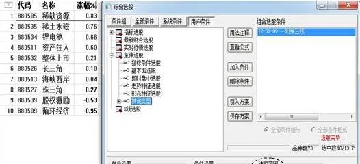 確認大盤滿足後,第一步流程要從所有的“概念板塊”中選出當天也出現一陽穿多線的指數,軟件篩選結果如下: