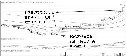 圖中顯示當時正處於一波下跌的末端,下跌趨勢明顯緩解後出現了一陽穿多線形態,且大幅放量,甚至滿足倍量條件,標的股質量優良。