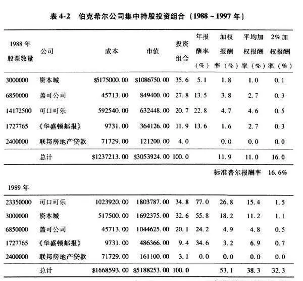 巴菲特曾經建議“那些什麼都不懂的投資人最好選擇指數型投資組合基金”,因爲最起碼他們的戰績不會輸給市場。但他同時認爲,對那些稍對投資有所瞭解,又能夠分析企業營運狀況,並且能夠找出5到10傢俱有長期發展潛力的投資標的的投資人來說,就沒有必要使用傳統的分散投資的方法了(見表4-2)。