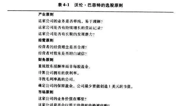 巴菲特採用的評估過程是首先檢驗自己的投資原則,再檢驗投資標的條件是否與投資原則相符合。在表4-1裏,我們羅列了巴菲特的投資原則,投資者也可以將它們看做檢驗投資標的質量的重要工具。其中,每一項原則都是一個可以獨立使用的分析工具,分析這些原則,將分析結果加以整合,便可以有效地找出那家公司最有可能具有不錯的營運表現。