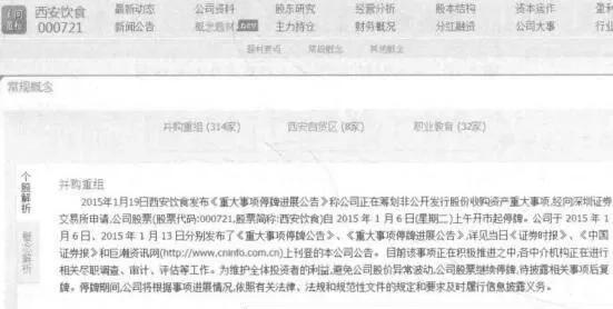 西安飲食在2015年1月6日宣佈因爲資產重組事項停牌,在2015年4月7日的復牌公告中顯示,在停牌期間,主要進行了籌劃非公開發行股份收購北京嘉和一品企業管理股份有限公司100%股權的重大資產重組事項。