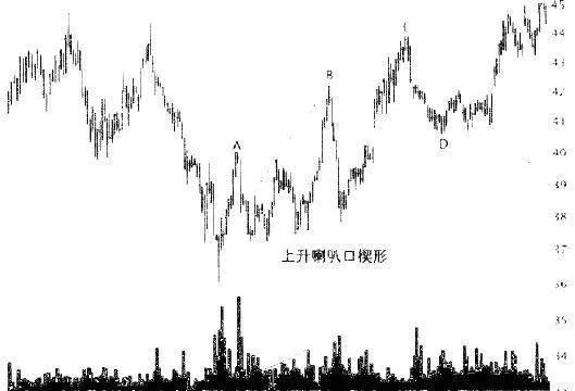 圖6.13 如圖所示是上升喇叭口楔形,但是你連接A、B、C三點能俗得到更大的一個上升喇叭口楔形。D點是一個局部下降的底部,在本例中成功預示了從圖形ABC中向上突破。