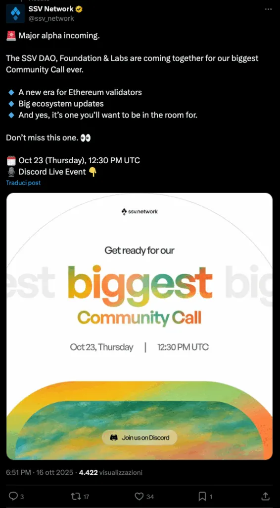 重磅消息來襲!SSV DAO、基金會和實驗室將攜手舉辦我們迄今爲止規模最大的社區會議。——以太坊驗證者的新時代;——生態系統重大更新;——沒錯,這是一場不容錯過的活動。千萬不要錯過!10月23日(星期四),UTC時間下午12:30。Discord直播活動。