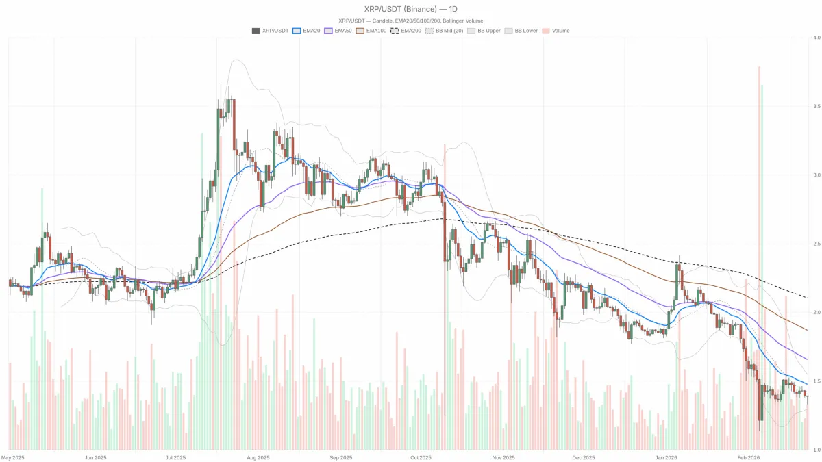 XRPUSDT 目前交易價格在1.39附近,日線趨勢明顯受損且仍呈下跌趨勢。價格低於所有關鍵日線均線和布林帶中線,而加密貨幣總市值下跌約 2.4%,恐慌與貪婪指數則深陷極度恐慌 (5)區間。換言之,市場避險情緒高漲,XRP 也處於防禦狀態。