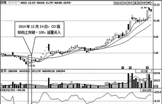 如上圖所示,保變電氣(600550)。保變電氣經過之前的加速下跌之後,2014年12月24日,該股股價出現企穩反彈跡象。同一天CCI指標由下向上突破了-100位置,說明這波下跌探底行情即將結束,股價可能反彈向上,投資者可以在當天尾盤或次日適量買入。