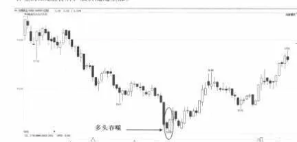 多頭吞噬是一個典型的止跌上漲信號,通常發生在下跌過程中,該K線組合由兩個 K線構成。第一個K線爲下跌K線,第二個爲上漲K線,其開盤價比前一天下跌K線的最低價還要低,而收盤價超過前一天的最高價。當出現該K線組合時,後市多半看漲,如圖1所示。