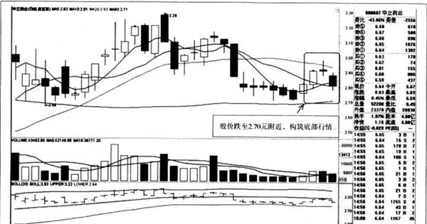 上圖爲2009年1月6一8日華立藥業的K線走勢。從圖中我們看到股價跌至2.70元附近,構築底部行情。這種K線形態加前五天連續小陰線,根據筆者多年的實戰觀察,該股構築底部的機會居多。爲什麼?因爲,第一,之前五天連續的小陰線已經令恐慌的投資者拋得七七八八。第二,連續小陽後的兩根小陰線應該是拉昇前最後洗盤。因此,目前該股應該屬於底部形態,投資者可大膽買入。