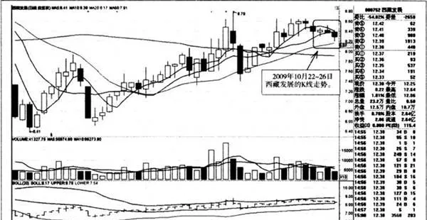 上圖爲2009年10月22-26日西藏發展的K線走勢。我們從圖中看到股價正在拉昇途中,主力機構在行進中洗盤,主要特點是跌幅不大,但是給持有該股的投資者一種極不安全的感覺,主力的目的是將不堅定的投資者清洗出來,使日後拉昇不會產生較大的拋壓。因此,大家日後見到升幅較小的股票出現這種K線形態時可以大膽繼續持股。