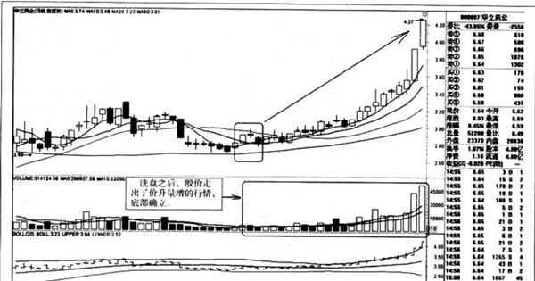 上圖爲2009年1月6日至2月13日華立藥業的K線走勢。該股洗盤之後,股價走出了價升量增的拉昇行情,底部確立。因此,此時買入是最正確的選擇。