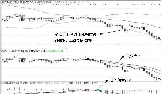 首次做空點在MACD發出下穿0軸信號的同時,而加倉點可在第一波殺跌後回抽均線受壓時,具體位置在圖中都做了標識,請注意理解。