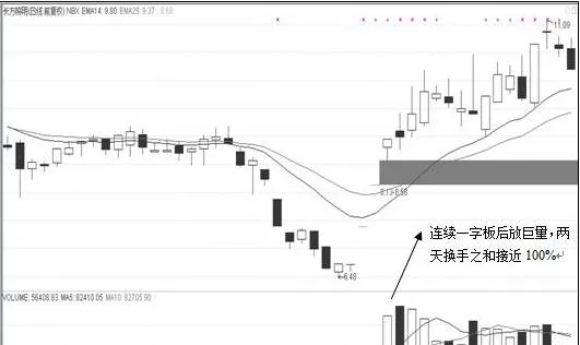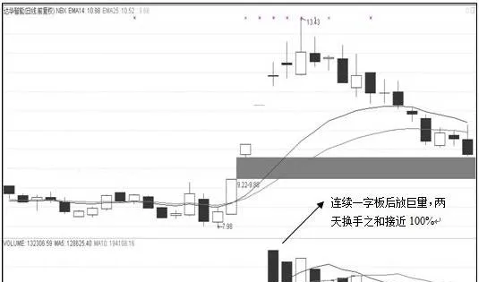 圖中顯示該股自低位起連續一字板,幾乎無成交量,但是股價在遭遇前期平臺時打開漲停,成交量快速放大,連續兩天的換手率之和接近100%,明顯滿足100%換手戰法。