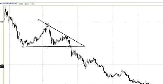 高點依次降低,低點持平,股價變化向下邊收效。兩個高點連級與兩個低點連線交叉成下降三角形。成交量在股價收斂過程中逐漸縮小。在股價突破反撲的過程中成交最較之前的上漲成交量縮小。