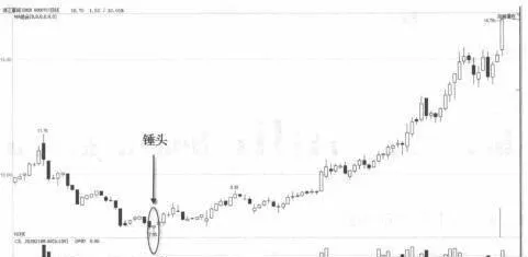 該K線實體部分比較短,而引線比實體長,或與實體相當。該K線通常出現在下跌過程中,不管該K線是陰線還是陽線,其含義都是一樣的。當然如果是上漲錘頭對於多方更爲有利。