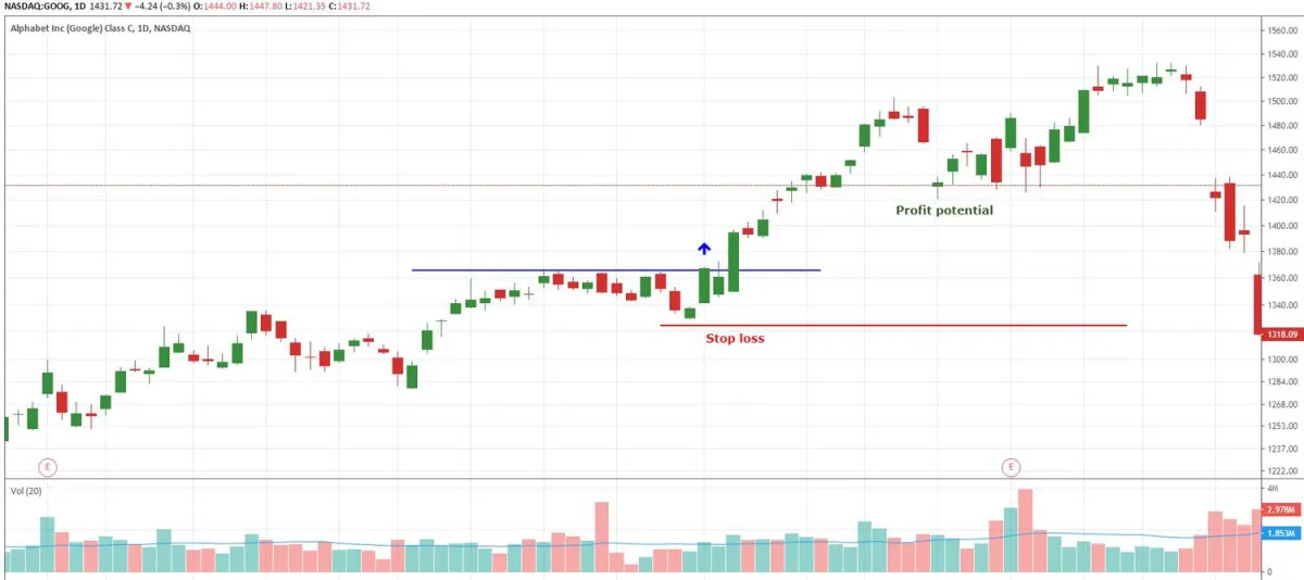 當Alphabet Inc. ( GOOG )股價突破短期阻力位(藍色水平線)時,可以利用其價格反應進行交易。當時股價整體處於上升趨勢,並在1365美元附近形成了一個波段高點。股價突破該水平後,觸發了做多交易。止損位設置在近期波段低點下方。